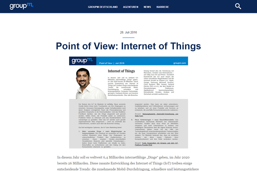 In diesem Jahr soll es weltweit 6,4 Milliarden internetfähige „Dinge“ geben, im Jahr 2020 bereits 26 Milliarden. Diese rasante Entwicklung des Internet of Things (IoT) treiben einige entscheidende Trends: die zunehmende Mobil-Durchdringung, schnellere und leistungsstärkere Computer-Technologie, geringere Hardware-Kosten und bessere Sicherheitsprotokolle. Sunil Bahl, Digital Strategist bei Mindshare, hat alles Wissenswerte zu diesem Thema zusammengefasst.