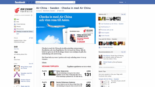 Air China flies not only to China but also throughout Asia. The challenge was how could Air China then raise the Swedish consumers awareness about this fact? In response their ad agency Rodolfo created a Facebook check-ins campaign.