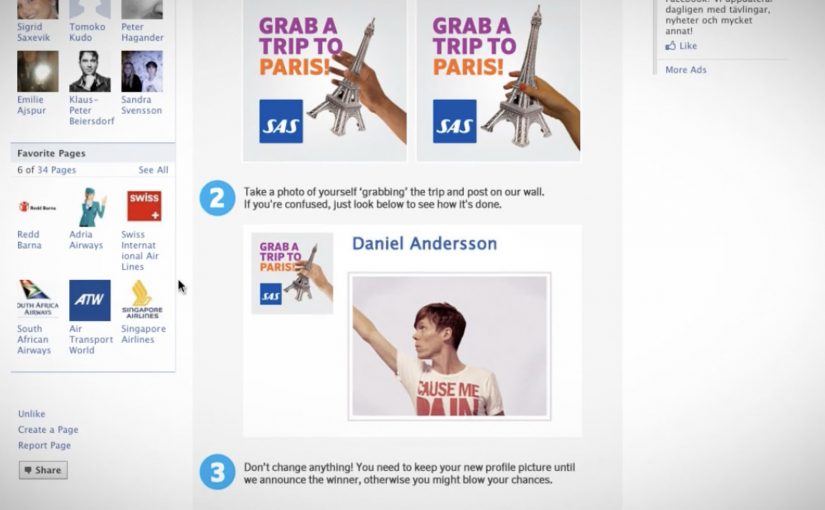 A Facebook contest where fans change their profile picture to a branded frame and post a “grabbing the trip” photo on the SAS wall to compete for a free flight.
