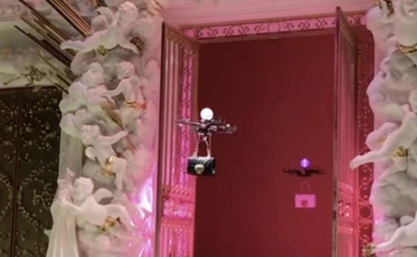 They opened a runway segment with drones carrying the brand’s Devotion handbags, replacing the expected human “bag parade” with flying copters.