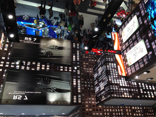 To make sure I did not miss Audi this year due to 200+ people standing in line to get into the Audi Stand, I decided to visit the stand very early in morning. The line to get into the stand was short, but there were already hundreds of people inside. On walking in, I noticed that the concept for the stand was taken straight out of the Hollywood movie “Upside Down“…