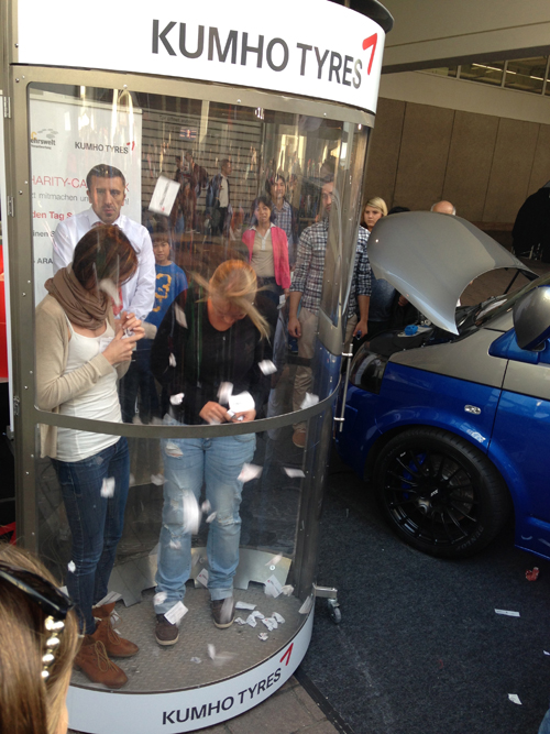 Then on the way out I spotted Kumho Tyres giving away various petrol and tyre related coupons. To win the coupons visitors had to catch them while being closed inside a wind cabin…