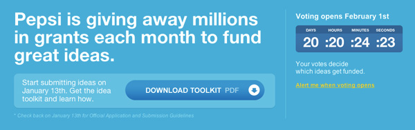 Pepsi wants to make the world a better place and so it has up to $1.3 million in Refresh grants to give out every month, ranging from $5000 through to $250,000.